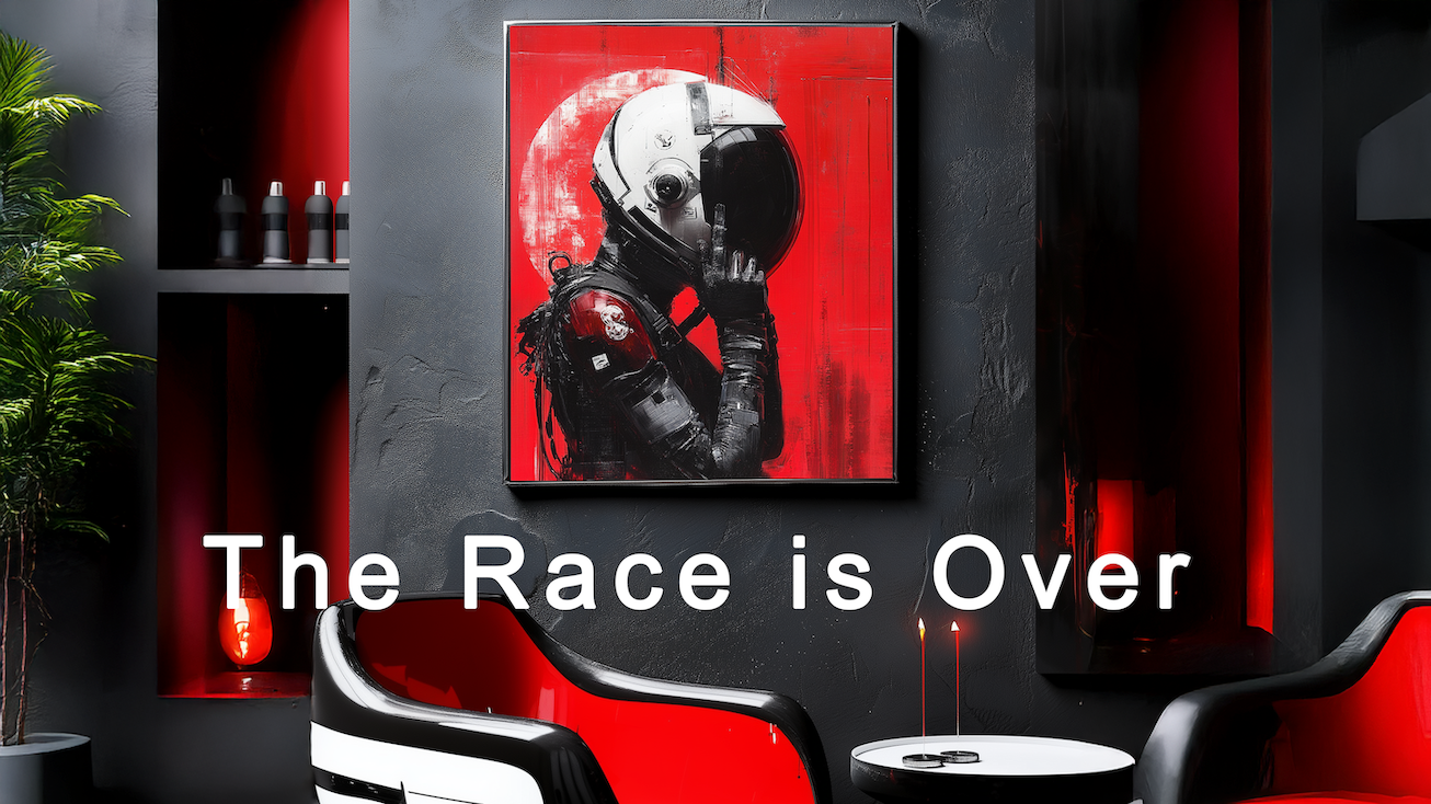 Hive Arts Studio, bekannt für seine Fähigkeit, abstrakte Kunst mit Elementen der Fiktion zu verweben, beschreibt „Das Rennen ist vorbei“ als ein Werk mit einer „nachdenklichen, fast melancholischen Atmosphäre“, das die Betrachter dazu auffordert, sich sowohl den Triumphen als auch den Opfern zu stellen, die mit dem Verfolgen der eigenen Ambitionen verbunden sind. Die gespannte Hand des Astronauten, die kurz davor steht, das Siegel seines Helms zu brechen, lädt zu Spekulationen über die darunter verborgenen Emotionen ein – eine Mischung aus Triumph, Müdigkeit und vielleicht sogar Beklommenheit, während er sich darauf vorbereitet, der Welt erneut gegenüberzutreten. Das Kunstwerk fordert uns auf, darüber nachzudenken: Was verbirgt sich hinter dem Visier? Welche Gedanken und Gefühle sind vor Blicken verborgen?