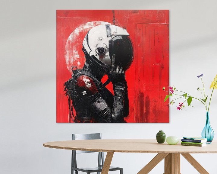 Sur un fond rouge profond, évocateur à la fois de passion et de fatigue, un soleil blanc déclinant projette une lueur éthérée, illuminant doucement la silhouette sombre de l’astronaute. Cette juxtaposition crée un effet visuel saisissant qui attire le spectateur, l’invitant à réfléchir sur les voyages terminés et les nouveaux commencements à l’horizon.