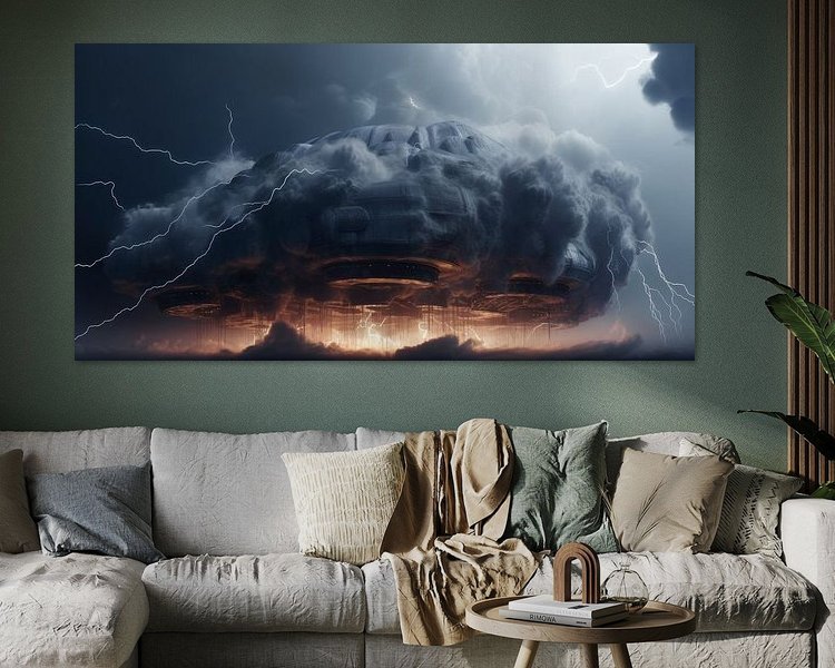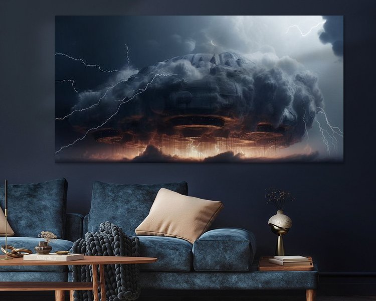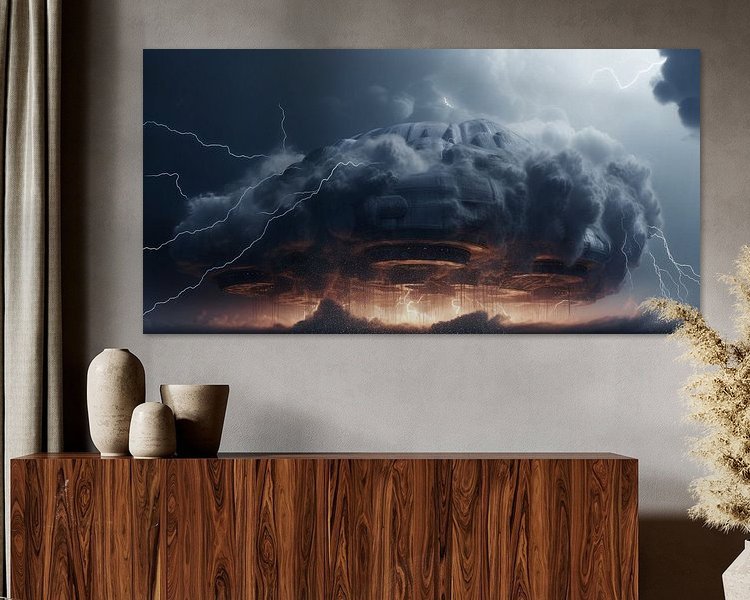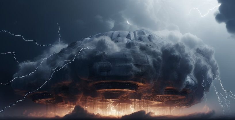Dans le calme d’une nuit tempétueuse, « Le Visiteur Inattendu » émerge tel une énigme visuelle. Cette pièce capture un moment fugace où le calme du familier est percé par la présence d’une entité imposante. Suspendu au milieu de la danse tumultueuse des nuages et des éclairs, il attire l’attention sans l’exiger. La palette sombre de l’œuvre et le contraste frappant de l’énergie ardente sous la structure évoquent un sentiment de crainte et de contemplation.