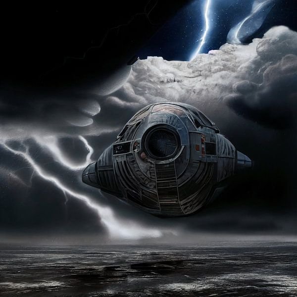 L’observateur éternel se tient fermement debout alors que les vents du temps et du chaos l’entourent. La composition subtile mêle habilement des éléments du décor tumultueux – la surface énigmatique de la planète cachée par les nuages, le tonnerre lointain et un soupçon d’obscurité – pour évoquer une atmosphère à la fois intrigante et mystérieuse.