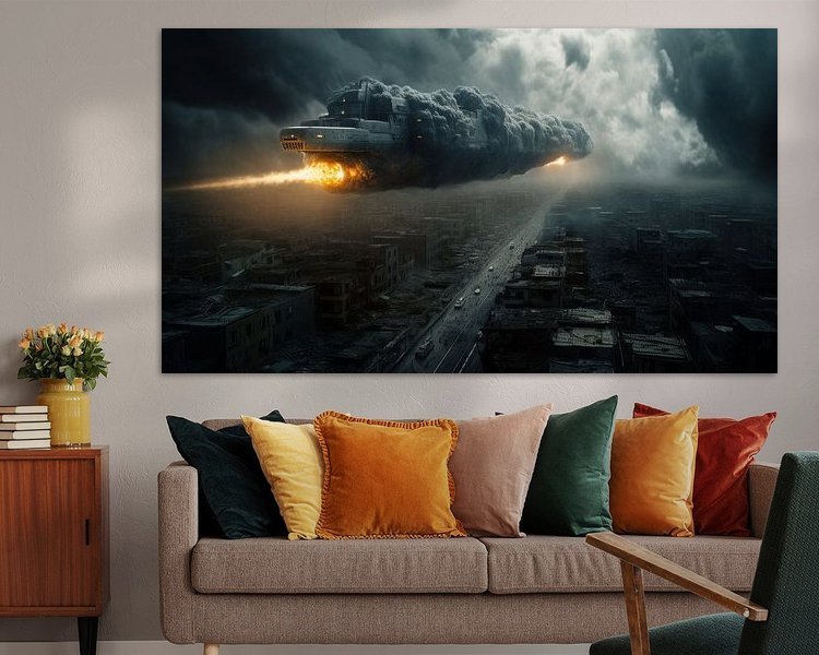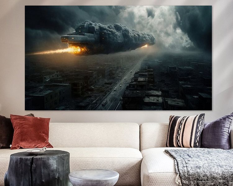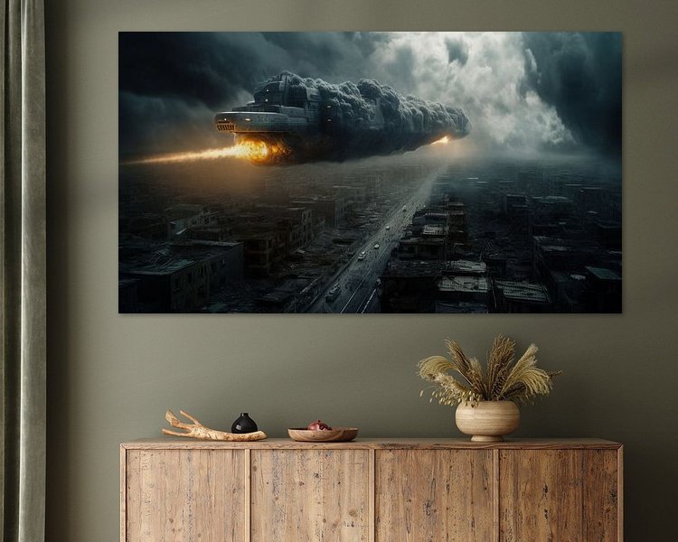 Dit tot nadenken stemmende tafereel past goed op de muren van een moderne woonkamer, een introspectief thuiskantoor of een loft in industriële stijl. Het ingetogen kleurenpalet en het diepzinnige onderwerp passen daar goed bij een ruimte die uitnodigt tot diepgaande discussies of persoonlijke reflectie. Het is een harde herinnering aan de kwetsbaarheid van onze maatschappelijke structuren en de blijvende kracht van de ongetemde krachten van de natuur en technologie.