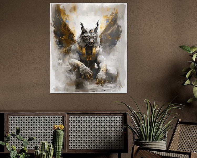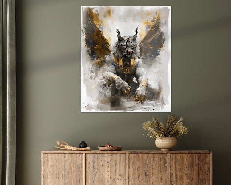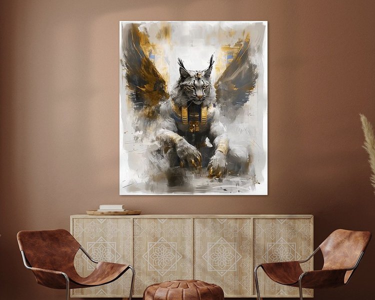 Een stille bewaker van vergeten rijken, de Lynx Sfinx zit er met een air van rustig gezag. Z’n gouden ogen lijken door de tijd zelf heen te prikken, geheimen bewarend die alleen de ouden zouden snappen. De katachtige vorm, koninklijk en machtig, is versierd met ingewikkelde gouden accenten, een weerspiegeling van z’n hemelse aard. Grote, donkere vleugels rusten aan z’n zijkanten, alsof ie elk moment klaar is om op te stijgen. In de verte staan de vervaagde contouren van een oude tempel als herinnering aan een lang vervlogen wereld. Kijk je beter, dan zie je de fijne graveringen op z’n sieraden, de delicate textuur van z’n vacht, en de subtiele gliefen verstopt in de achtergrond—elk een fluistering van een vergeten verhaal.