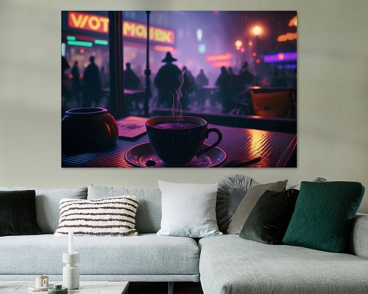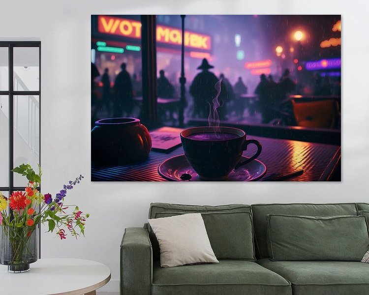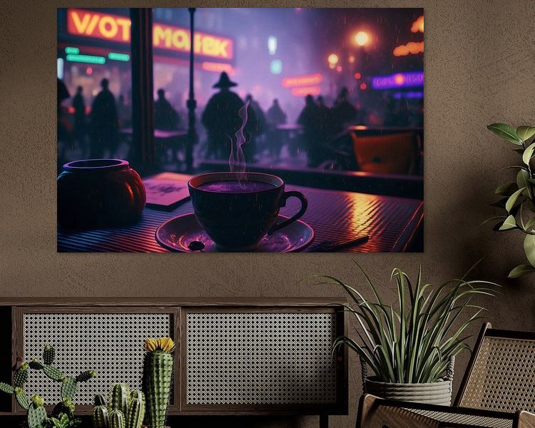 Coffee in the Rain” is een prachtige aanwinst voor elk huis en straalt een gevoel van warmte en rust uit. Het verandert je woon- of slaapkamer moeiteloos in een levendige, stijlvolle ruimte. Met zijn neonverlichte stadslandschap en retro-futuristische vibe is dit digitale kunstwerk een visuele traktatie voor fans van vaporwave en cyberpunk subculturen.