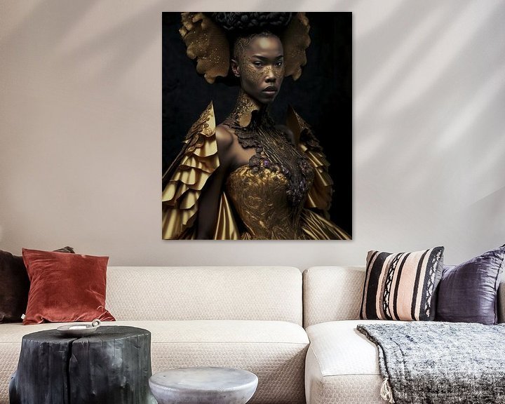 We hebben iets nieuws: “Fashion, Avant Garde, Golden Wedding Dress,” een toffe digitale kunstprint die er echt chic en luxe uitziet. Perfect om je kamer mee op te leuken! Dit unieke stuk toont een fascinerend portret van een verbluffende vrouw in een ingewikkelde goudzwarte trouwjurk, die de essentie van avant-garde mode belichaamt.