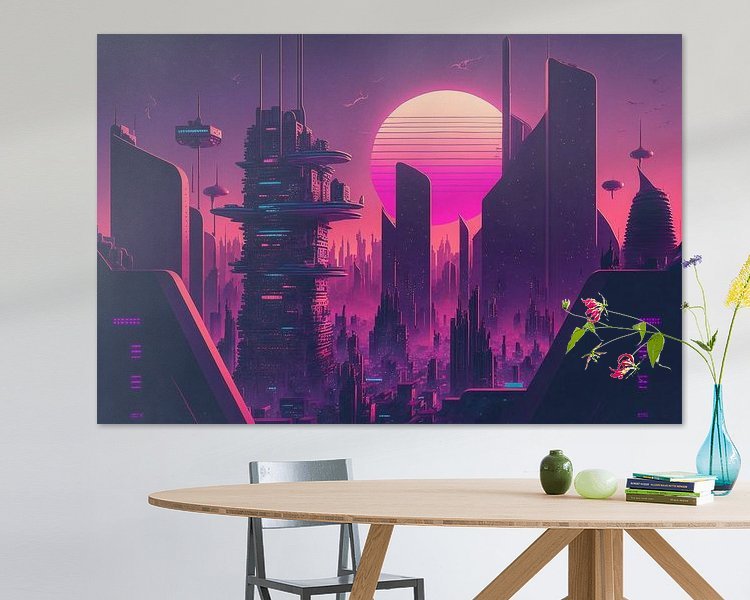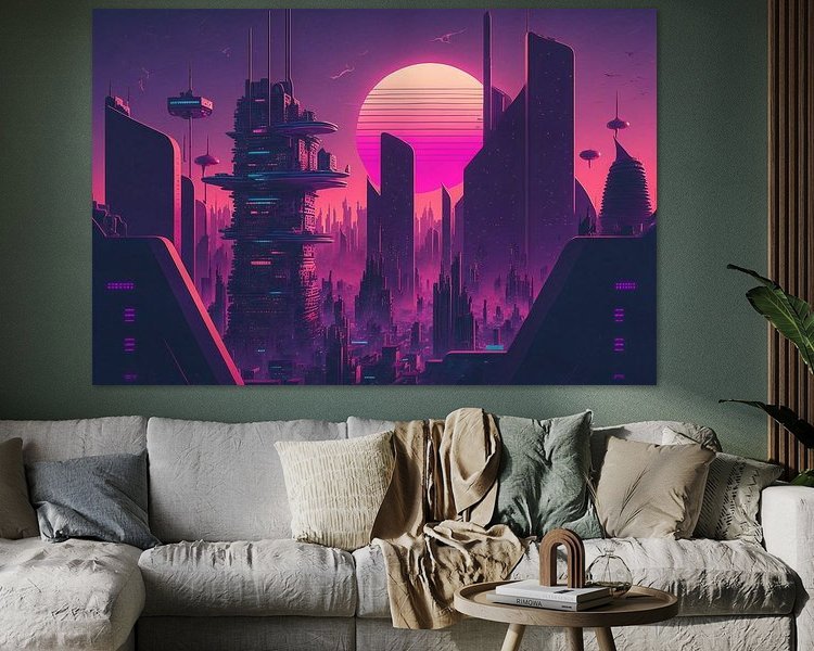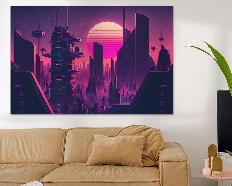 Of je nu herinneringen op wilt halen aan vervlogen tijden of gewoon op zoek bent naar een opvallend stuk muurkunst dat de essentie van de vaporwave-beweging weergeeft, “Retro futuristische stad” is de perfecte keuze. Versier je muren met dit opmerkelijke kunstwerk en laat de levendige kleuren en fascinerende beelden je meevoeren naar een wereld waar retro en futuristisch in perfecte harmonie samengaan.